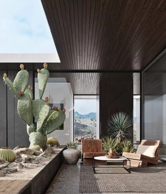 除了木石和植物、桌椅家具之外,還可以在室內(nèi)與室外庭院之間,選擇使用一面大大的落地窗。對(duì)室內(nèi)而言,不僅增加了空間的采光,而且人們?cè)谑覂?nèi)也可以坐看花開花落、云卷云舒,同時(shí)還不會(huì)遭受惡劣天氣的影響,烹煮一杯茶,靜享閑暇愜意的時(shí)光,感悟禪意滋味。